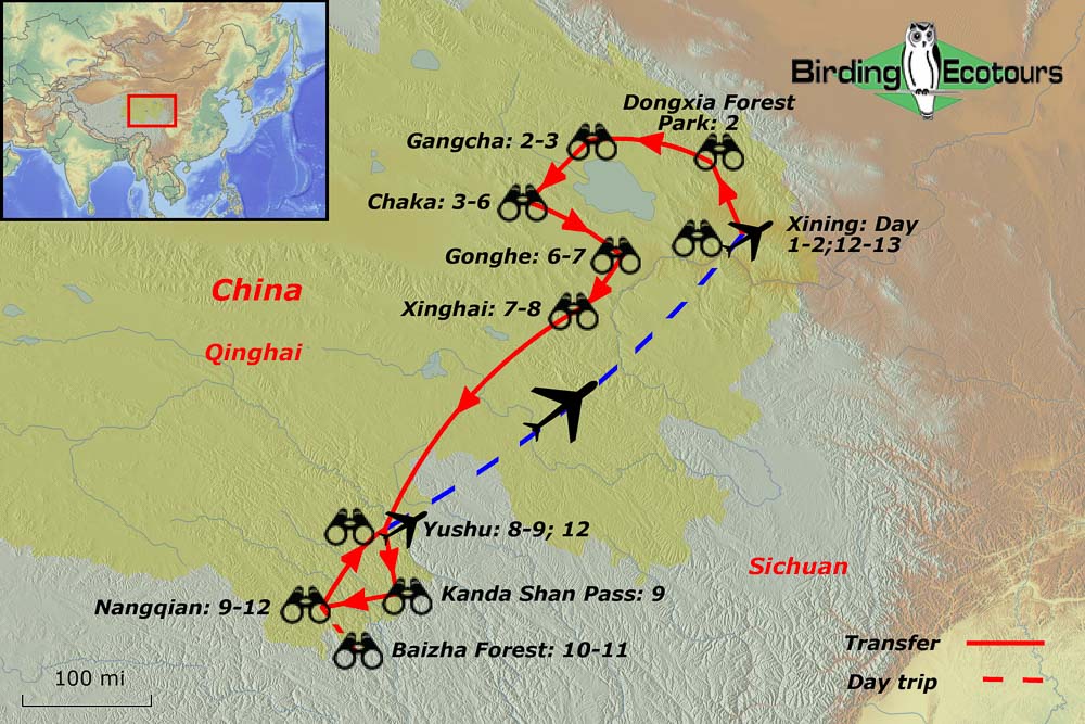 From Yushu, we first target the spectacular Chinese Rubythroat and White-capped Redstart, before continuing to the excellent Kanda Shan Pass, where we will continue our quest to see the Qinghai-Tibet Plateau specialists. Top targets in the scrub-covered slopes and open alpine meadows include Tibetan Babax, and Tibetan Bunting, along with Snow Pigeon, Pink-rumped Rosefinch, and Red-fronted Rosefinch. Our final birding of the tour will be at our southernmost point, at Baizha Forest. Arriving here early, we target the endemic Buff-throated Monal-Partridge, White Eared Pheasant, Tibetan Partridge, Blood Pheasant, then, amongst the quiet forest trails and alpine meadows, we will look for localized species such as Chinese Fulvetta, Giant Laughingthrush, Three-banded Rosefinch, and Tibetan Serin, along with woodpeckers, tits, warblers, rosefinches and many more. We then board an internal flight to Xining, where the tour ends.