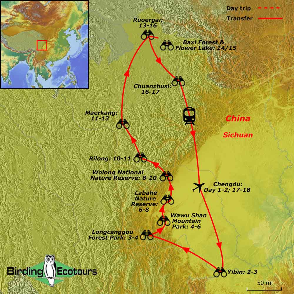 This Sichuan tour can be combined with either our China Bird Tour: Spring Specials Yunnan Birding Tour (before) or with our China Bird Tour: Qinghai and Tibetan Plateau Birding Tour (after), or both – to make a mind-boggling 40-day China mega tour! It is even possible to combine it with our Taiwan Bird Tour: Endemic Birding Extravaganza tour, which precedes the Yunnan tour.